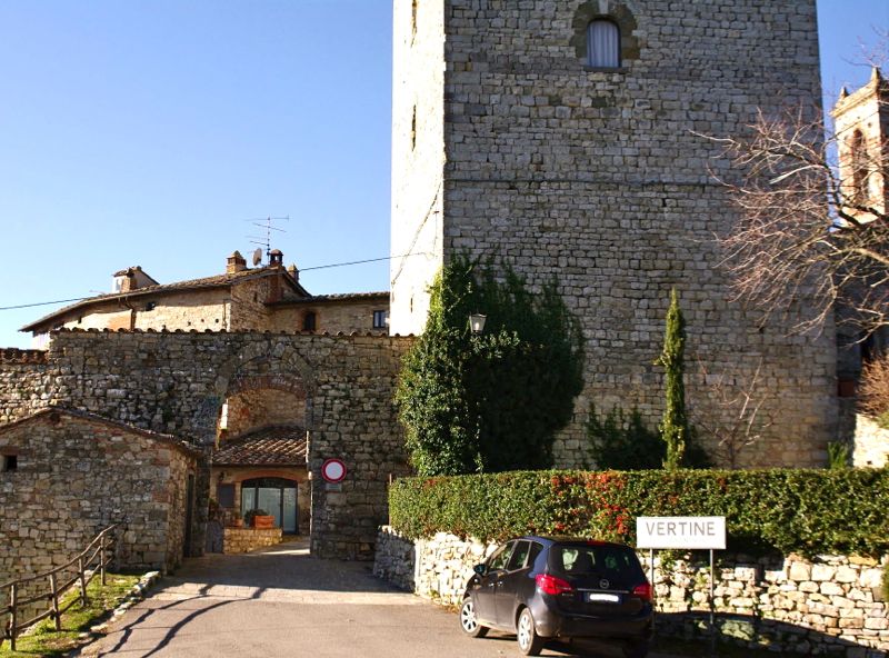 La prima menzione del Castello di Vertine risale a un documento privato del 1013 mentre in un atto del 1049 un tale Pietro di Pietro dona al monastero di Coltibuono l' Integram suam portionem de castello e curte de Vertine, sempre da quel documento risulta che la località fosse sede di una corte. Solo nel 1202 si ha la prima indicazione sulla presenza dei Ricasoli che poi ne furono proprietari fino all'epoca moderna. Nel 1312 e nel 1351 alcuni esponenti della famiglia Ricasoli compirono degli atti di ribellione nei confronti dell'autorità fiorentine e dei membri della loro famiglia rimasti fedeli a Firenze, questi atti sembra siano stati compiuti con il concorso dei senesi. Durante le guerre aragonesi, tra il 1452 e il 1478, il castello divenne la principale residenza dei Ricasoli che in quel periodo avevano la carica di Commissari della Repubblica di Firenze per il Chianti. Oggi Vertine è un borgo fortificato visitato da un notevole numero di turisti attratti dalla notevole conservazione del suo centro abitato e dal fatto di essere nel territorio del Chianti Classico.Vertine si presenta racchiuso nelle sue mura difensive, in origine il circuito murario si sviluppava con un andamento grossomodo ellittico ed era scandito da alcune torri, una della quali, in corrispondenza della principale porta di accesso costituiva il Cassero. Oggi la cinta muraria manca in alcuni tratti come sul retro della chiesa parrocchiale e nei pressi della porta meridionale, che era posta esattamente all'opposto di quella del cassero. Le due porte sono collegate da una strada che ancora oggi presenta tracce dell'acciottolato medievale.